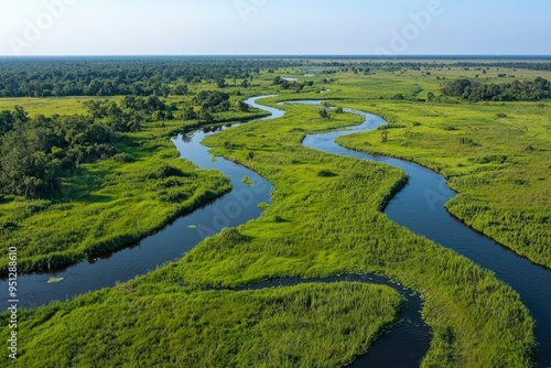 Aerial View of a Serpentine River Winding Through Lush Green Grasslands