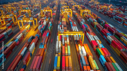 Aerial view of a shipping port with many colorful cargo containers and cranes at night. Transport and export industry at a commercial dock.