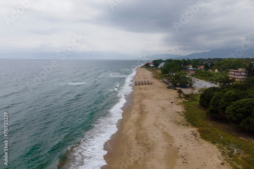 Aerial view of a small empty beach along the Strymonian Gulf in the Aegean Sea, Nea Kerdylia, Central Macedonia, Greece.