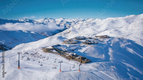Aerial view of a snowy mountain resort with ski lifts and buildings.