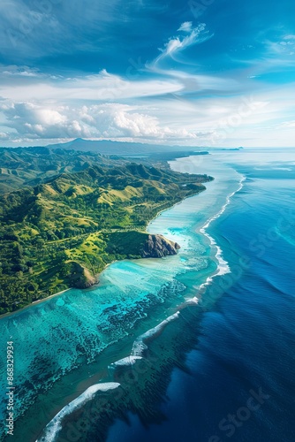 Aerial view of a stunning tropical coastline with turquoise waters, lush green hills, and a dramatic coastline, showcasing the beauty of nature.