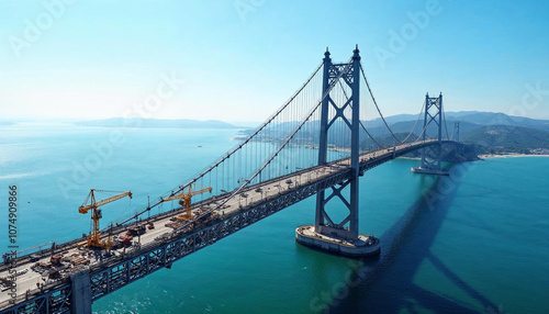 Aerial view of a suspension bridge under construction, highlighting its scale, engineering, and workers amidst the sea.