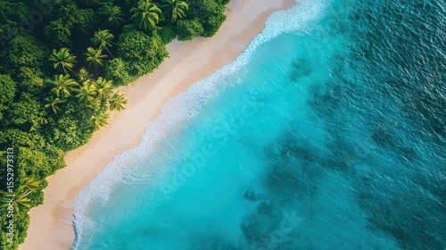 Aerial view of a tropical beach with lush green palm trees, white sandy shore, and clear turquoise ocean water.