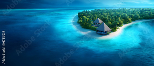 Aerial view of a tropical island surrounded by clear blue waters, featuring lush greenery and secluded beachfront villas.