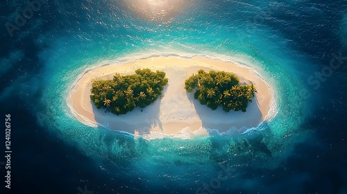 Aerial view of a tropical island surrounded by crystal-clear turquoise waters, featuring lush greenery and soft sandy beaches, evoking a serene and idyllic atmosphere.