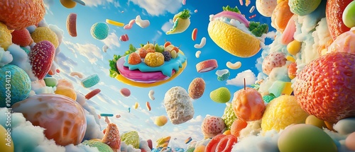 Aerial view of a vibrant utopian city, surreal culinary landscapes blending seamlessly, colorful dishes floating in the sky, dreamlike atmosphere, photorealistic style