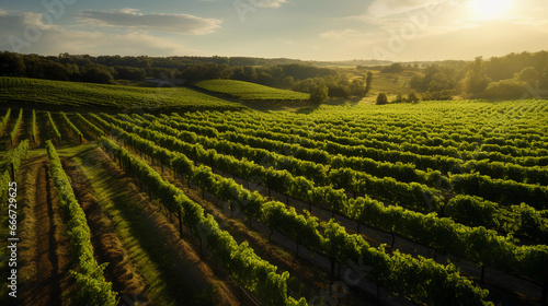 aerial view of a vineyard, lush green rows, ripe grapes ready for harvest. Late afternoon sunlight casting long shadows