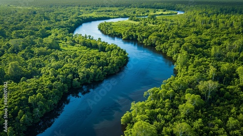 Aerial view of a winding river flowing through lush green forest.