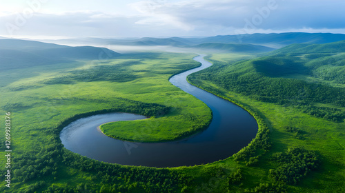 Aerial view of a winding river meandering through lush green fields, surrounded by mountains under a bright sky, showcasing the beauty of nature and tranquility.