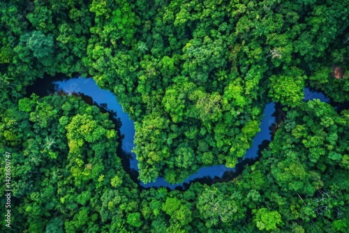 Aerial view of a winding river surrounded by lush green rainforest foliage in a vibrant ecosystem