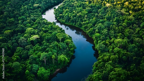 Aerial view of a winding river surrounded by lush green rainforest, showcasing nature's beauty