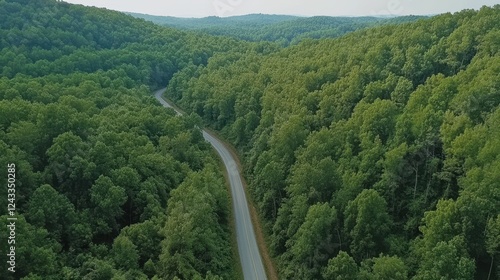 Aerial view of a winding road through a lush forest, featuring a train alongside, showcasing the blend of nature and transportation.