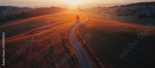 Aerial view of a winding rural road at sunset surrounded by rolling hills and open space ideal for text placement