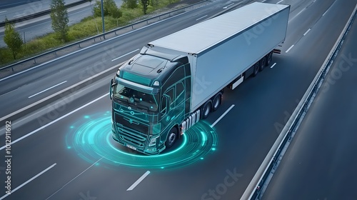 Aerial view of an autonomous truck on autopilot on a highway, using traffic sensors for navigation