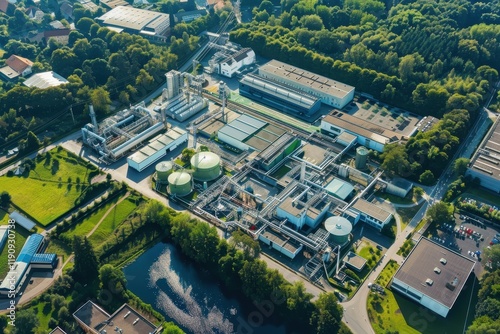 Aerial view of an industrial facility surrounded by greenery and water bodies.