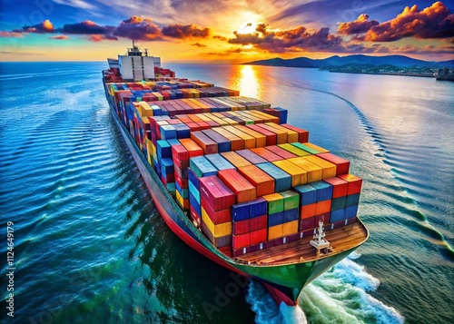Aerial View of an Ultra Large Container Vessel Loaded with Colorful Shipping Containers at Sea, Showcasing Maritime Logistics and Global Trade Dynamics
