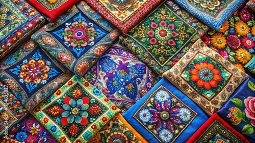 Aerial View of Authentic Silk Neck Scarves in Vibrant Ukrainian Patterns, Showcasing Traditional Designs and Textures in Stunning Drone Photography