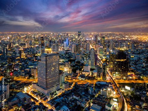 Aerial view of Bangkok skyline and skyscraper with BTS skytrain Bangkok downtown. Panorama of Sathorn and Silom business district Bangkok Thailand at night.