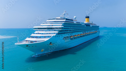 Aerial view of beautiful white cruise ship above luxury cruise in the ocean sea at early in the morning time concept smart tourism travel on holiday vacation time on summer, webinar banner