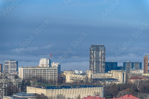 Aerial view of building rooftops over the clouds in Dnipro, Ukraine.