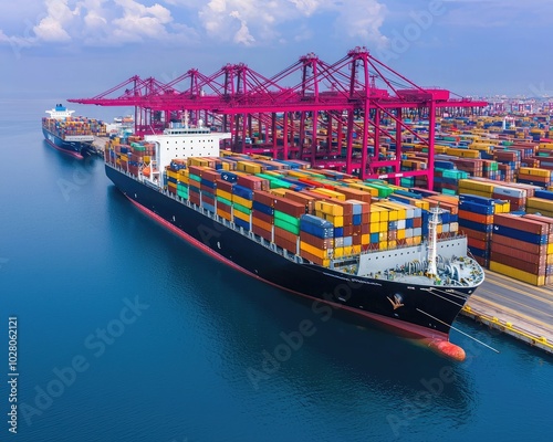 Aerial view of cargo ship docked at port, surrounded by colorful shipping containers and cranes against a blue sky.