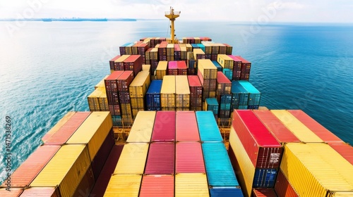 Aerial view of cargo ship with colorful containers, deep blue ocean, clear sky, organized logistics, clean top view, global shipping, commercial transport, banner, maritime freight, banner, sea, boat.