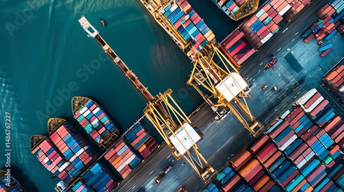 Aerial View Of Cargo Ships And Shipping Containers At A Busy Commercial Port