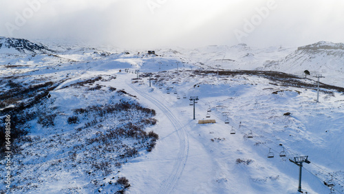 Aerial view of Caviahue Ski Resort chairlifts and snowy slopes in winter.