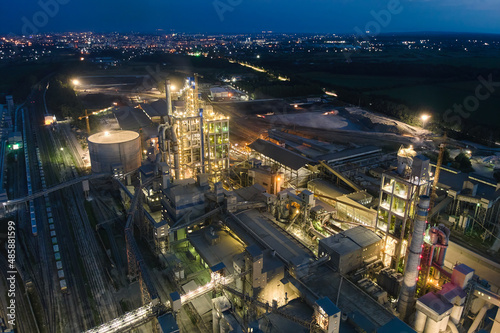 Aerial view of cement factory with high concrete plant structure and tower cranes at industrial production area at night. Manufacture and global industry concept