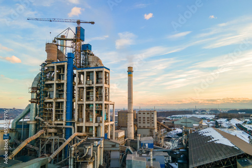 Aerial view of cement plant with high factory structure and tower crane at industrial production area at sunset.