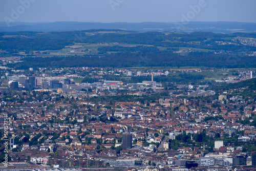 Aerial view of City of Zürich seen from local mountain Uetliberg on a sunny spring day. Photo taken May 18th, 2022, Zurich, Switzerland.