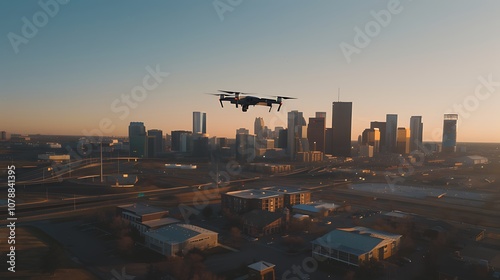Aerial view of city skyline with drone casting shadow over buildings, empty streets symbolizing state of alert.