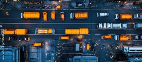 Aerial view of city street, buses and vehicles at night, urban landscape, transportation