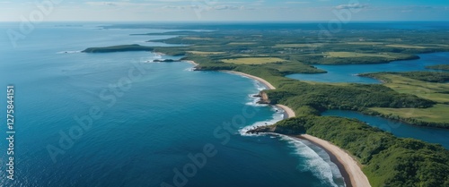 Aerial View of Coastal Landscape Featuring Pristine Blue Waters, Lush Green Hills, and Serene Beaches Under Clear Skies.