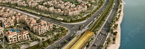 Aerial View of Coastal Urban Development Featuring Roads and Waterfront Promenade.