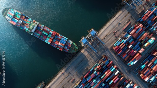 Aerial view of container ship docking at port, 3D illustration.