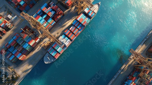 Aerial view of container ship docking at port, 3D illustration.