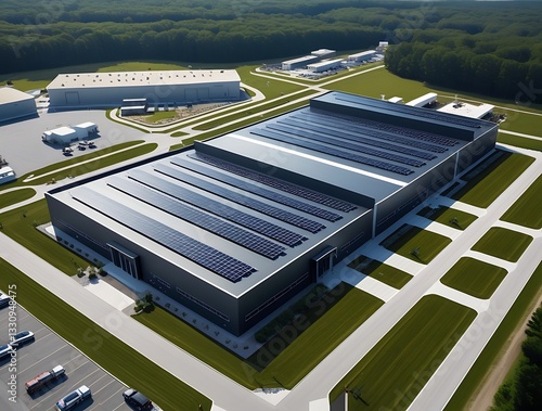 Aerial view of contemporary warehouse or factory building featuring a full solar panel roof installation surrounded by lush greenery, representing eco-friendly industrial design