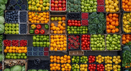 Aerial view of crates filled with various fruits and vegetables, symbolizing organized logistics and distribution in the fresh produce industry.
