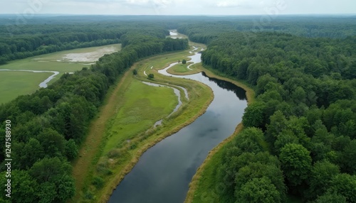 Aerial view of curvy river winding through green forest, marshland in Poland. Nature scene with flowing water, trees. Summer landscape shows tranquil, beautiful countryside. Natural environment.