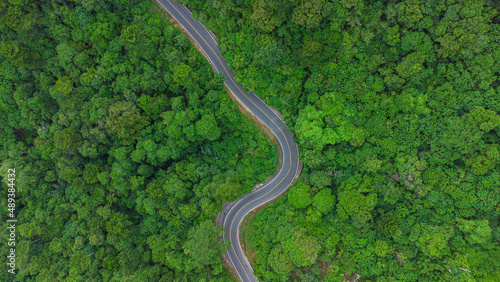 Aerial View of Curvy Road Winding Through Dense Tropical Forest