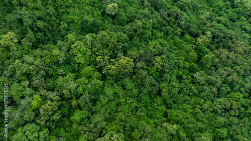 aerial view of dark green forest Abundant natural ecosystems of rainforest. Concept of nature forest preservation and reforestation.