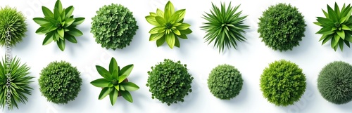 Aerial view of diverse green shrubs, bush plants arranged in creative botanical pattern on white background. Assortment of foliage, leaves, vegetation for landscape design, garden planning,