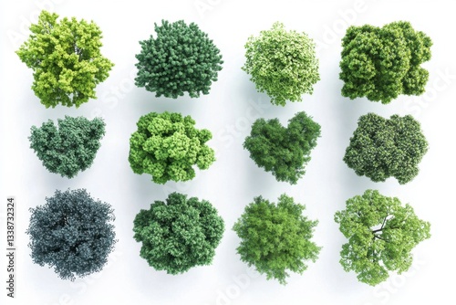 Aerial View of Diverse Green Trees on White Background Showcasing Lush Foliage and Natural Beauty for Landscaping and Environmental Design