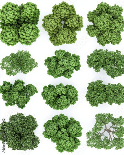 Aerial View of Diverse Green Trees on White Background Showcasing Lush Foliage and Natural Textures for Landscaping Design