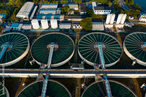 Aerial View of Drinking water treatment plant. Microbiology of drinking water production and distribution, water treatment plant. Microbiology of drinking water production. Morning scene,