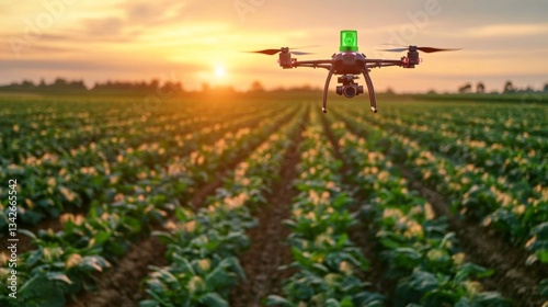 Aerial View of Drone Flying Over Green Agricultural Field at Sunset with Bright Sky and Rows of Healthy Crops