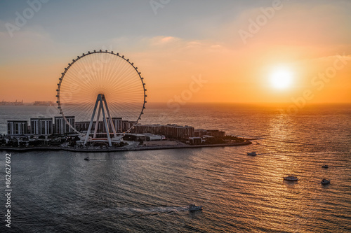 Aerial view of Dubai Marina with Ain Dubai Ferris wheel at sunset, United Arab Emirates.