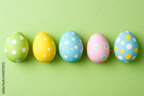Aerial view of Easter decorations featuring a row of multicolored eggs isolated on a teal background with copyspace