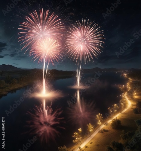 Aerial view of fireworks exploding over a lake or waterway at night, waterway, aerial view, serene atmosphere